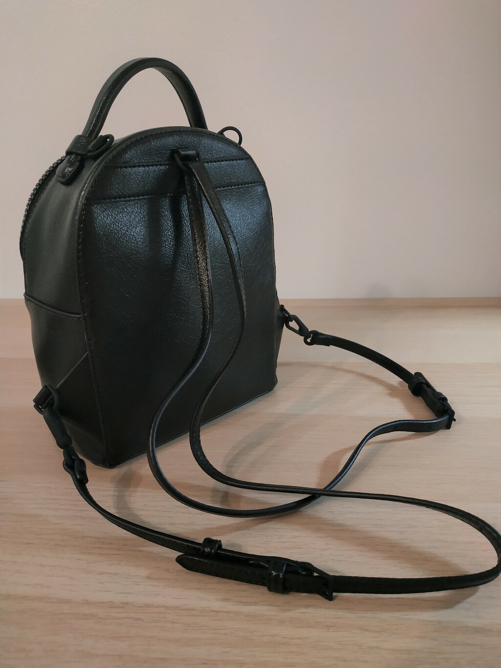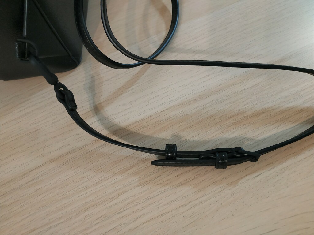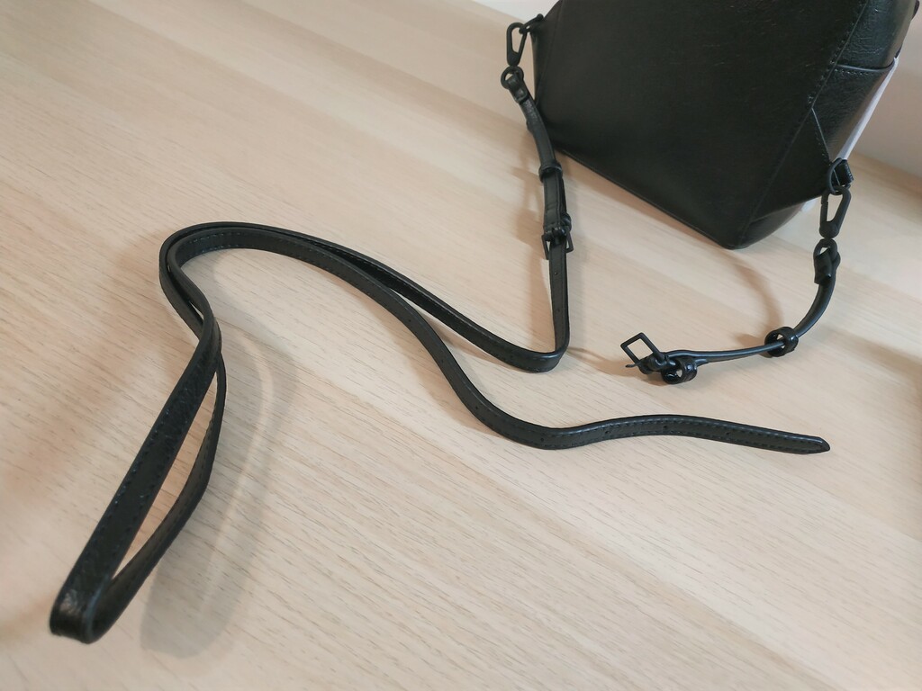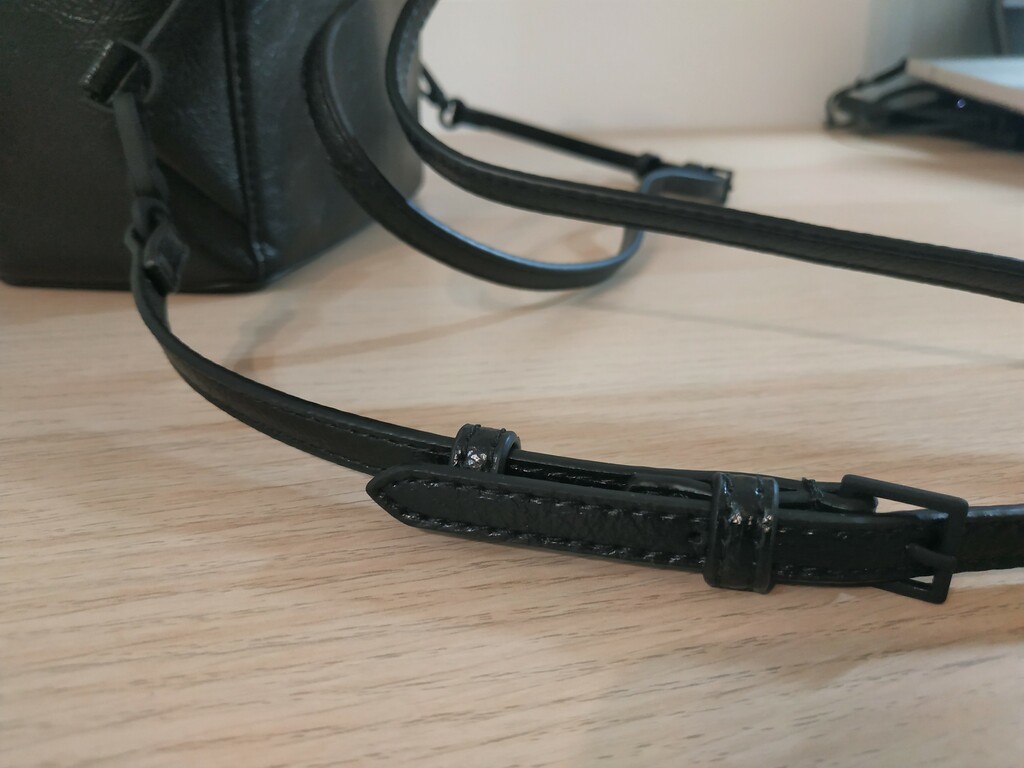 然後我覺得最有趣的是這個背帶! 一開始看到還研究了一下,果然是處處是驚喜 XD 它是一整條連著的完整帶子穿過包包中間頂端的扣環變成雙肩背帶,然後兩側和皮帶相似的小機關可以讓你調整背帶長度,或是完全拆下來然後重新扣在包包頂端的小耳朵扣環上變換背法!